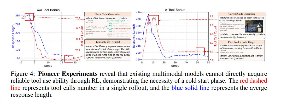 - 视觉搜索(Retrieval-Augmented Generation, RAG)领域:Mini-o317通过构建 Visual Probe 数据集、采集冷启动数据和引入 over-turn masking 策略(鼓励更多轮回答) 来提升基于图像的工具使用和推理能力,能够在测试时自然扩展到数十个回合,从而在挑战性的视觉搜索任务中实现最先进的性能。阿里VRAG-RL 20
