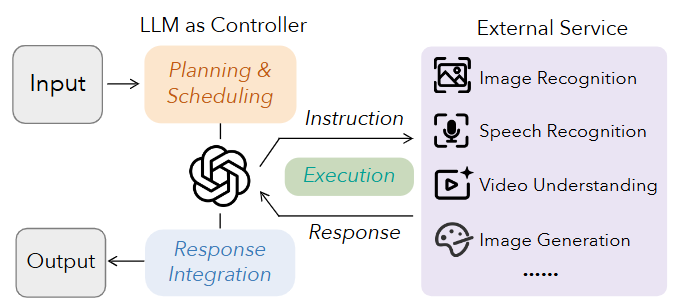 外部服务集成建模将大语言模型作为功能核心,通过调用外部 API(如文生图模型)来完成生成任务。2